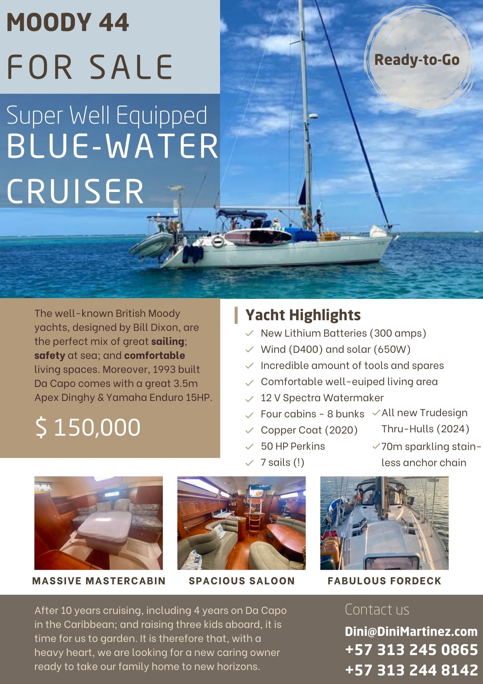 After ten years of raising our kids, first on a Moody 425 in the Med and the last few years on our Moody 44, Da Capo, in the Carribbean, the whole family needs some land - and our beloved, reliable, extremely well-equipped, ready-to-go, comfortable and safe, centre-cockpit blue-water cruiser a new, loving owner.